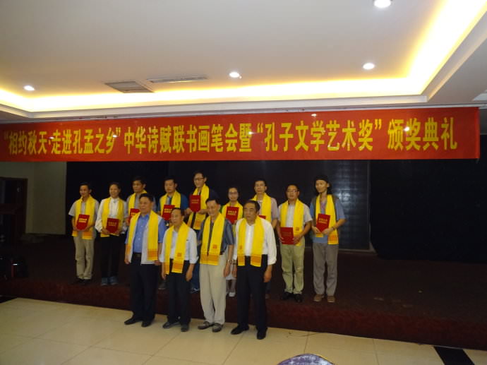 2015年9月25日至29日,在丹桂飘香、硕果累累的金秋时节,由中国楹联学会、中国楹联教育杂志社、中华诗赋联文化工程院、中国文学杂志社、中国孔子画院、济宁市文化广电新闻出版局、济宁市文学艺术界联合会、济宁市儒家文化与企业发展协会等单位联合主办的“相约秋天•走进孔孟之乡”中华诗赋联书画笔会暨“孔子文学艺术奖”颁奖典礼在济宁隆重举行,来自全国各地的100多名嘉宾参加了会议。